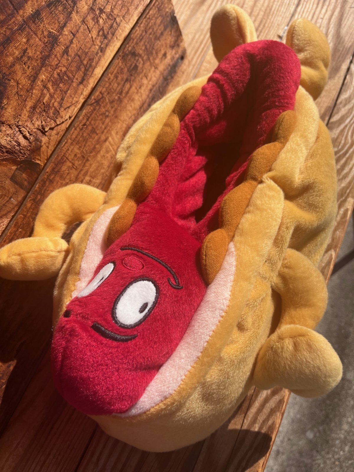 WIENERSCHNITZEL🌭スリッパーDOLL入荷です。アウトソール35cmもの大きなサイズですので、ペアーではなく(ᵔᴥᵔ)ディスプレイDOLLとして♪個別での販売にしました。内タグ付きのD.STOCK品で、とても良い状態です。ディスプレイやティッシュケース(ネピアだと少し小さいです)、携帯電話、小物入れとして、、、、オススメです。