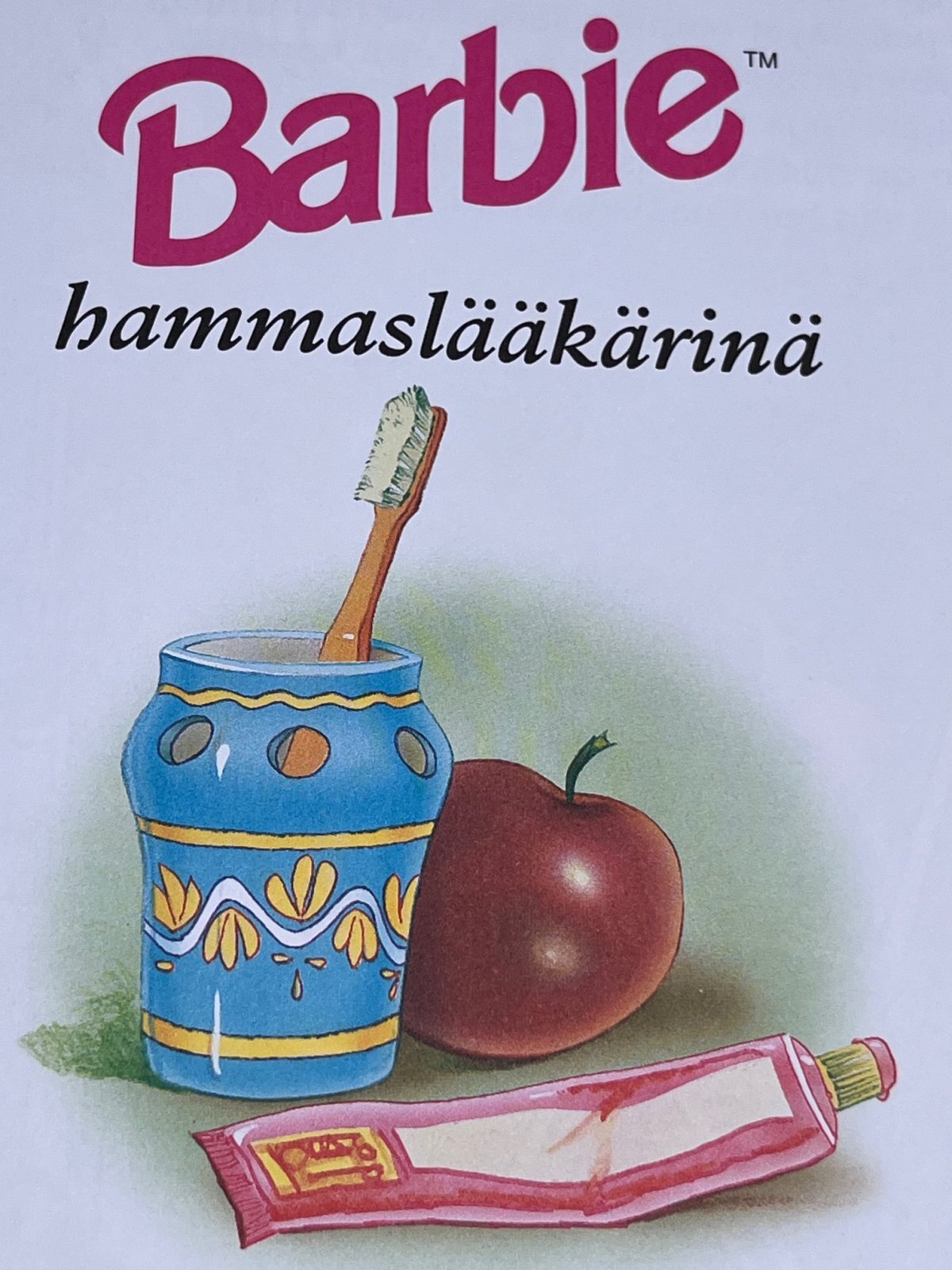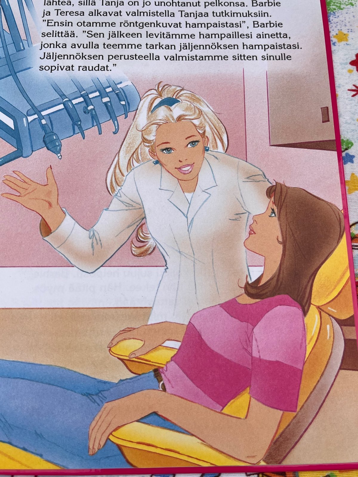 BARBIE 1997年 歯医者さん🦷絵本 入荷です。42ページフルカラーの♫ハードカバーBOOK♫♫表紙に加えて、中のイラストデザインが!!!最高です。初見のフィンランド語バージョン(フィンランドで仕入れました) 日本だと、なかなか出ないと思います。コレクションに、おすすめの一冊です。