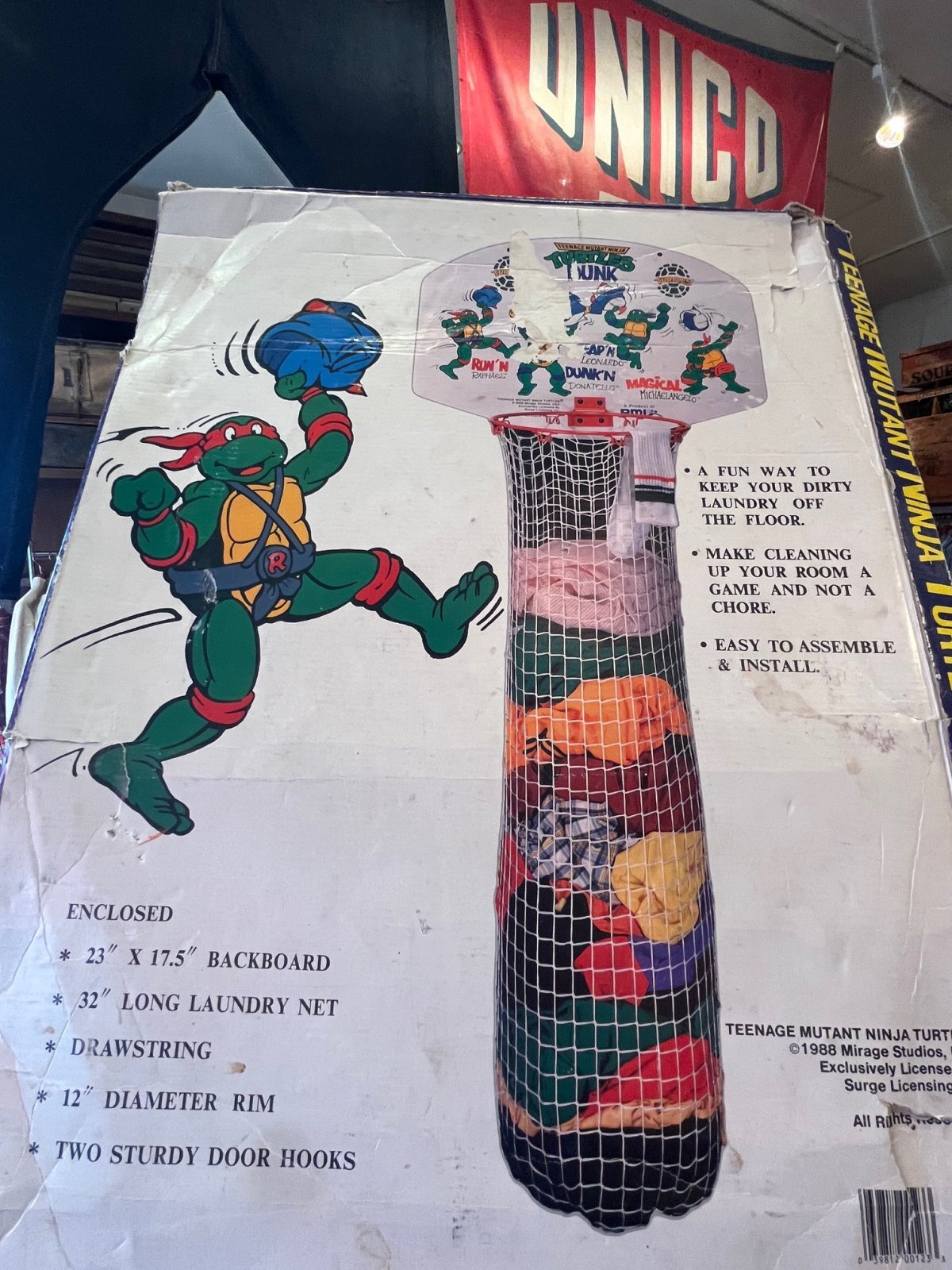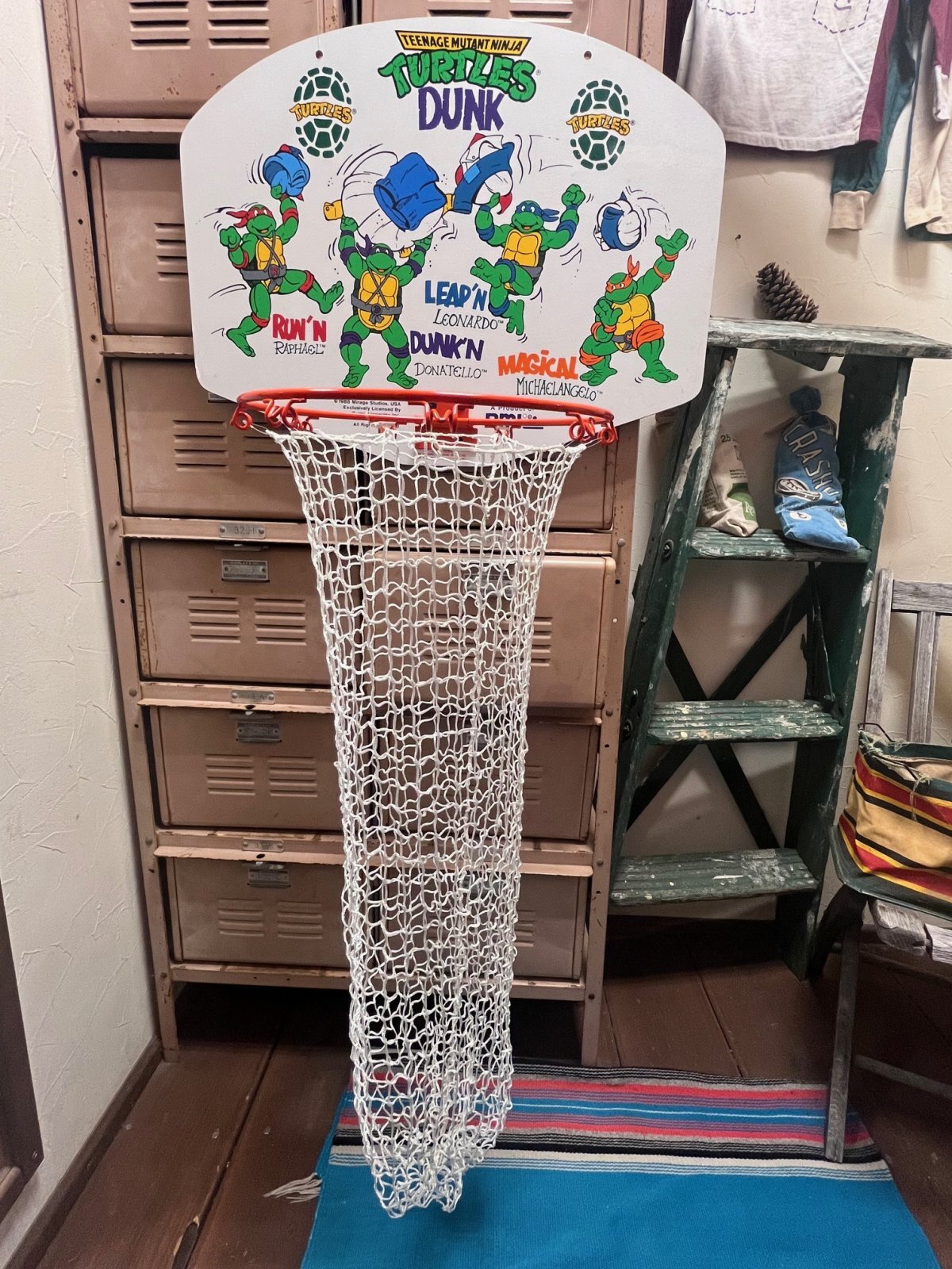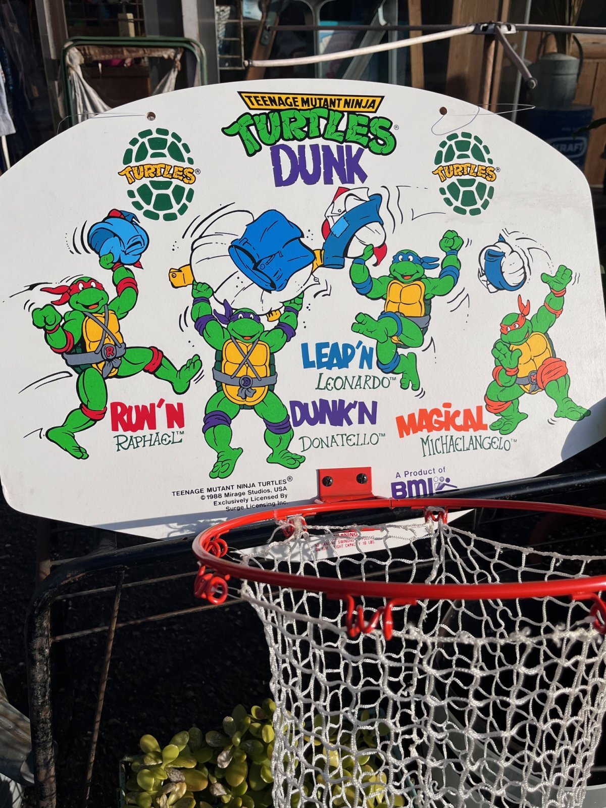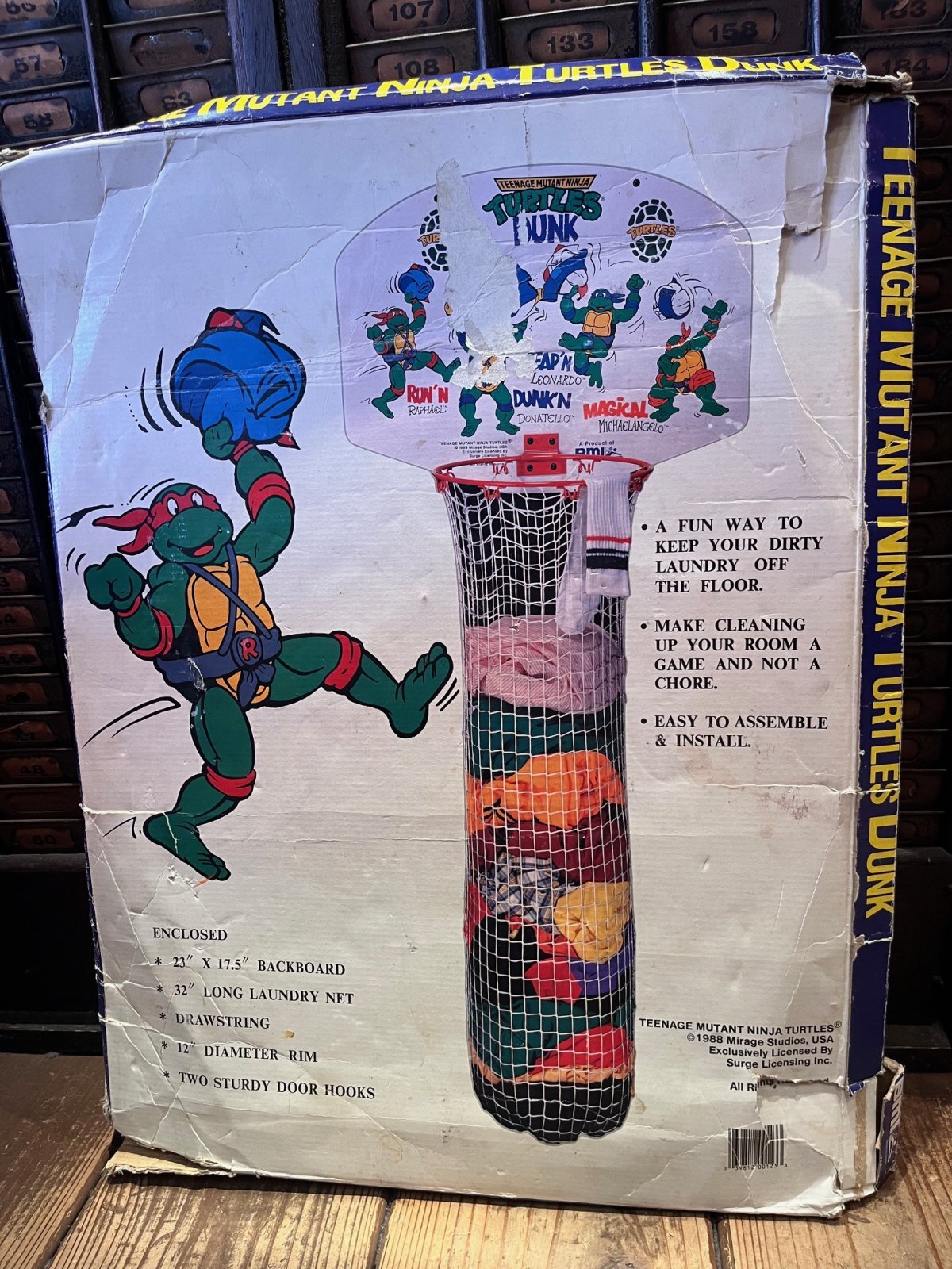 TEENAGE MUTANT NINJA TURTLES 1988年 BASKET HOOP入荷です。箱に傷みはございますが、中のバスケゴールは良い状態です。お部屋にバスケットコートを作るのはもちろん🏀ランドリーバッグとしてご利用いただけます。脱いだ服を!バシッとゴールを決めて!!遊んで整理整頓(ᵔᴥᵔ)出来ます。ぬいぐるみなどを入れて魅せるおもちゃ箱として、ご利用いただけます。80-90'Sが、お好きな方に、ドンストライクだと思います。なかなか出ないので、お探しだった方にオススメです。