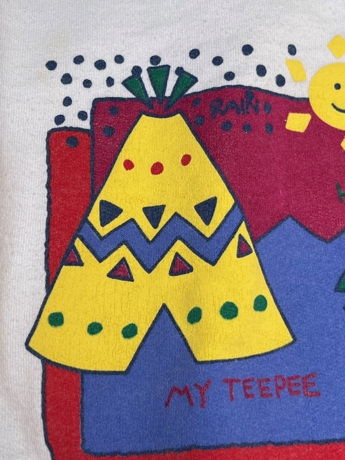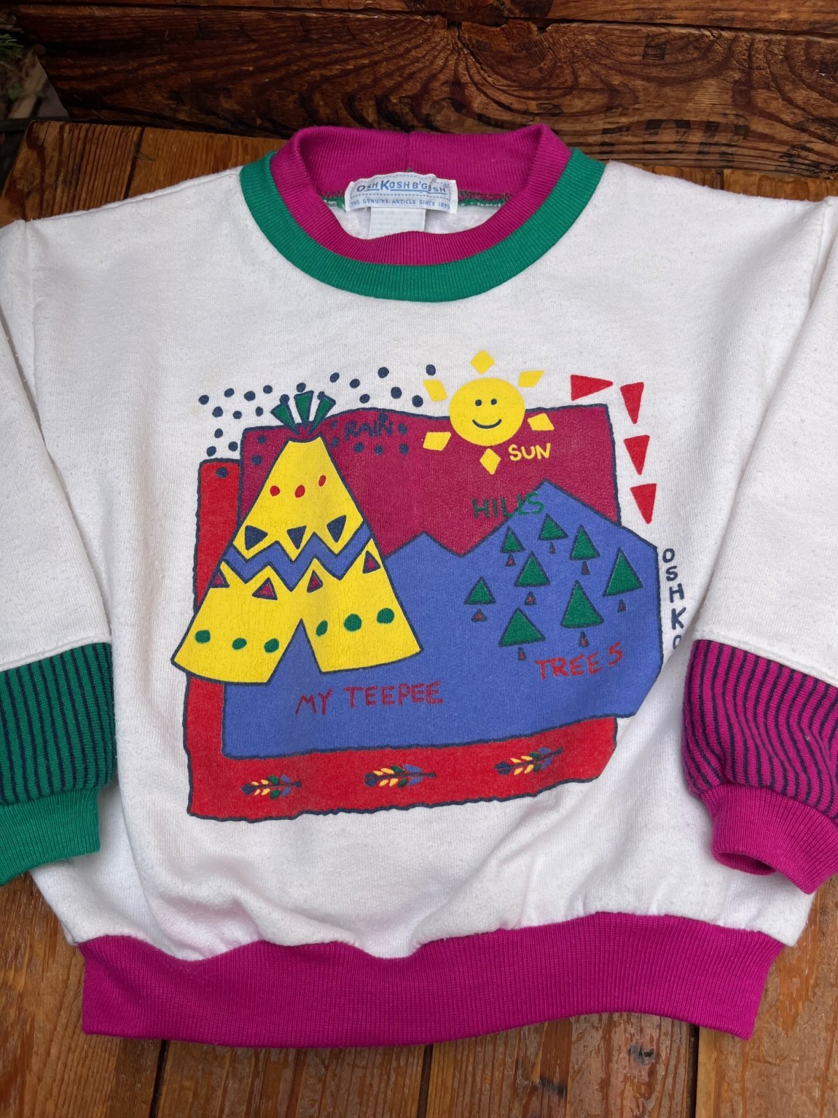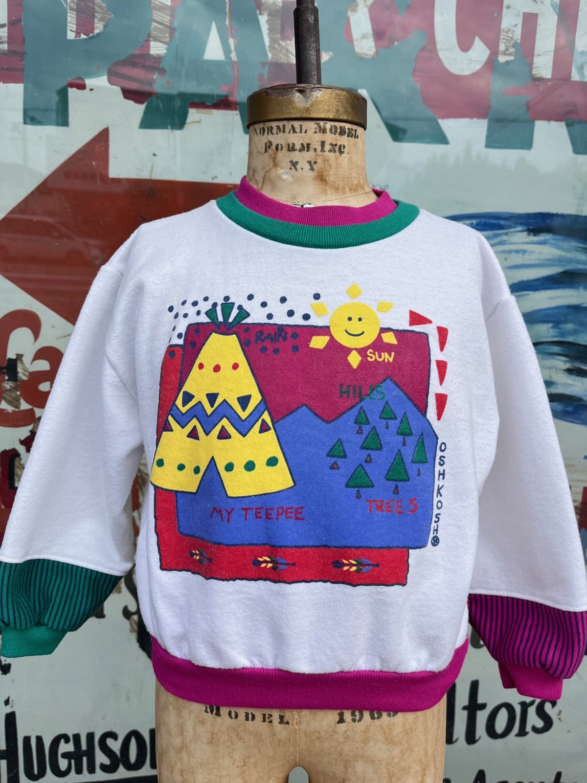 OSHKOSH ”MADE IN USA" KIDS VINTAGE スウエット 入荷です。MY TEEPEE🌵太陽サンサン🌵OSHKOSH解釈のネイティブアメリカンデザインが、とっても可愛い一着です。薄いシミあり。(洗濯済みです。気にならないと思います) 4歳表記: 3〜4歳くらいのお子様に良いサイズです。4歳サイズのトルソーに着用させた写真を添えます。どうぞご参照ください。古いOSHKOSH KIDSをコレクションされてる方に、おすすめです。