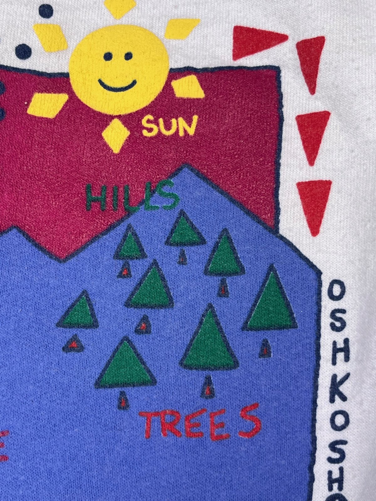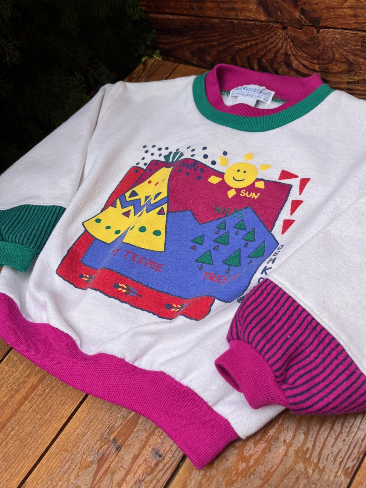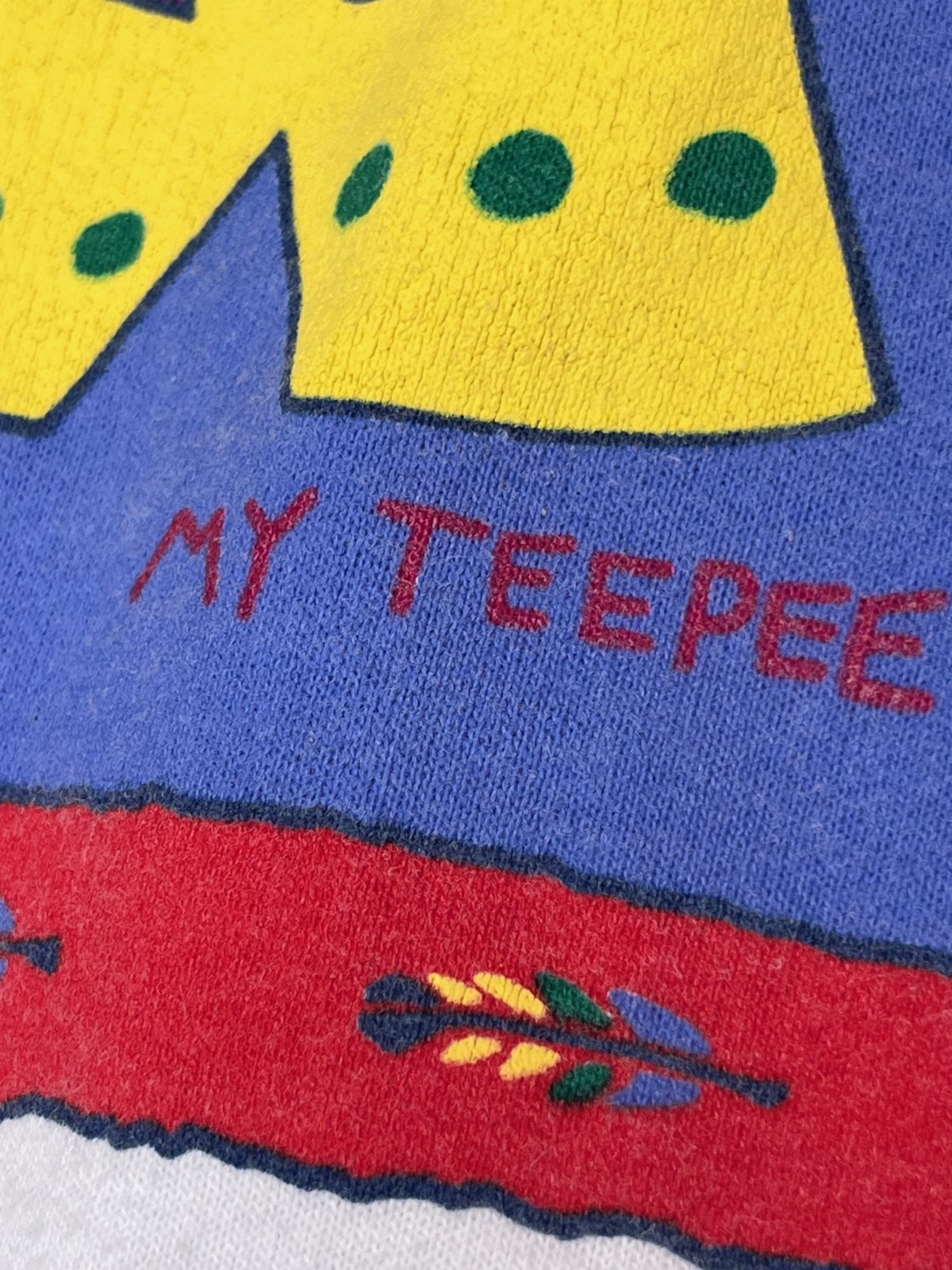 OSHKOSH ”MADE IN USA" KIDS VINTAGE スウエット 入荷です。MY TEEPEE🌵太陽サンサン🌵OSHKOSH解釈のネイティブアメリカンデザインが、とっても可愛い一着です。薄いシミあり。(洗濯済みです。気にならないと思います) 4歳表記: 3〜4歳くらいのお子様に良いサイズです。4歳サイズのトルソーに着用させた写真を添えます。どうぞご参照ください。古いOSHKOSH KIDSをコレクションされてる方に、おすすめです。