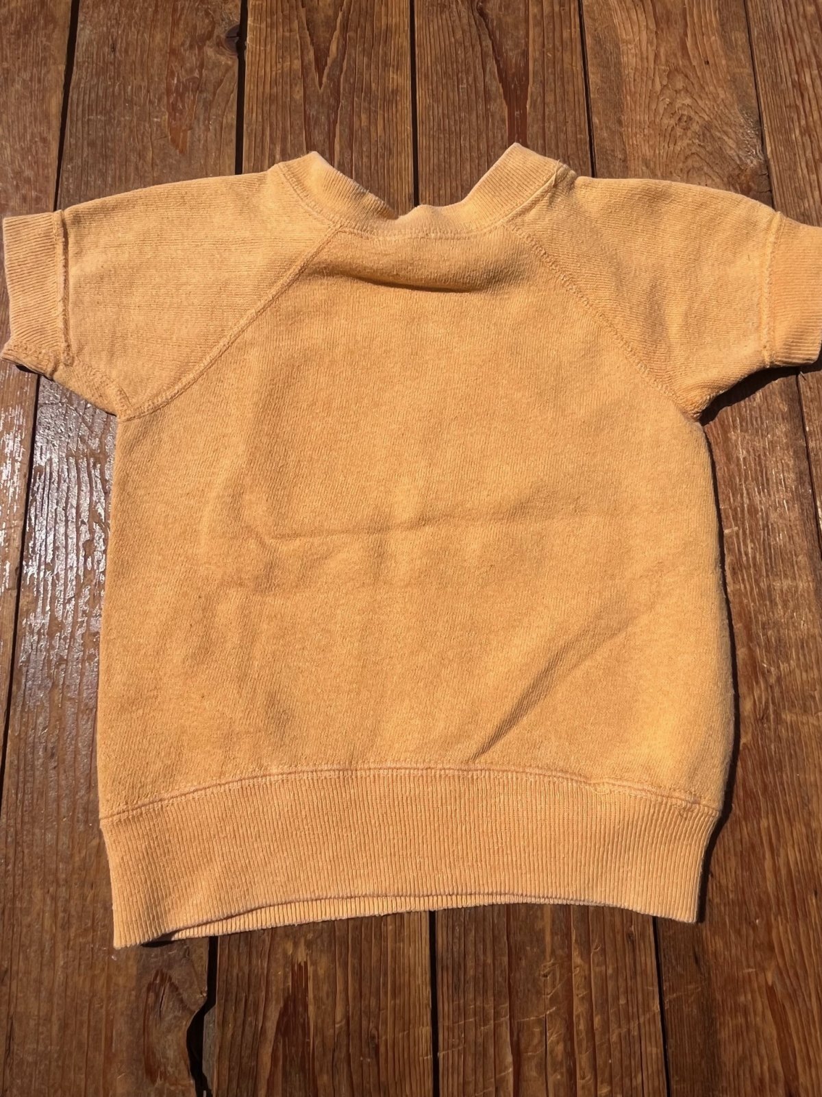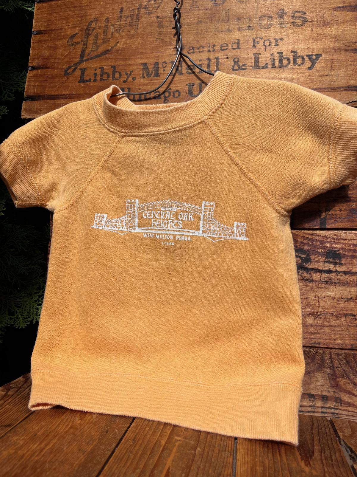 CHEV CRAFT "SPORTSWEAR" 1960年代 KIDSスウエット入荷です。GOODカラー🍢カラシの半袖スウエット です。アメリカ・ペンシルバニア州WEST MILTONにある歴史的な施設CENTRAL OAK HEIGHTSがデザインされた🇬🇧東海岸・英国の風香る♪上品な一着です。VINTAGE好きなお母さん(ᵔᴥᵔ)お父さんに気に入っていただけると思います。4歳表記: 3歳くらいのお子様に良いサイズです。お部屋やお店のディスプレイにも、おすすめです。