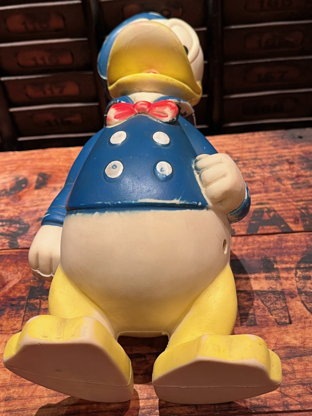 DONALD DUCK 1950年代 ソフビフィギイア入荷です。サンラバー社製のLARGEサイズ♬ ノッポドナルド👀下目使いの♪とってもカワイイ一体です。ペイントロスあり。鈴なりなし。まだカラーのしっかり残った一体です。コレクションやお部屋のディスプレイにおすすめです。