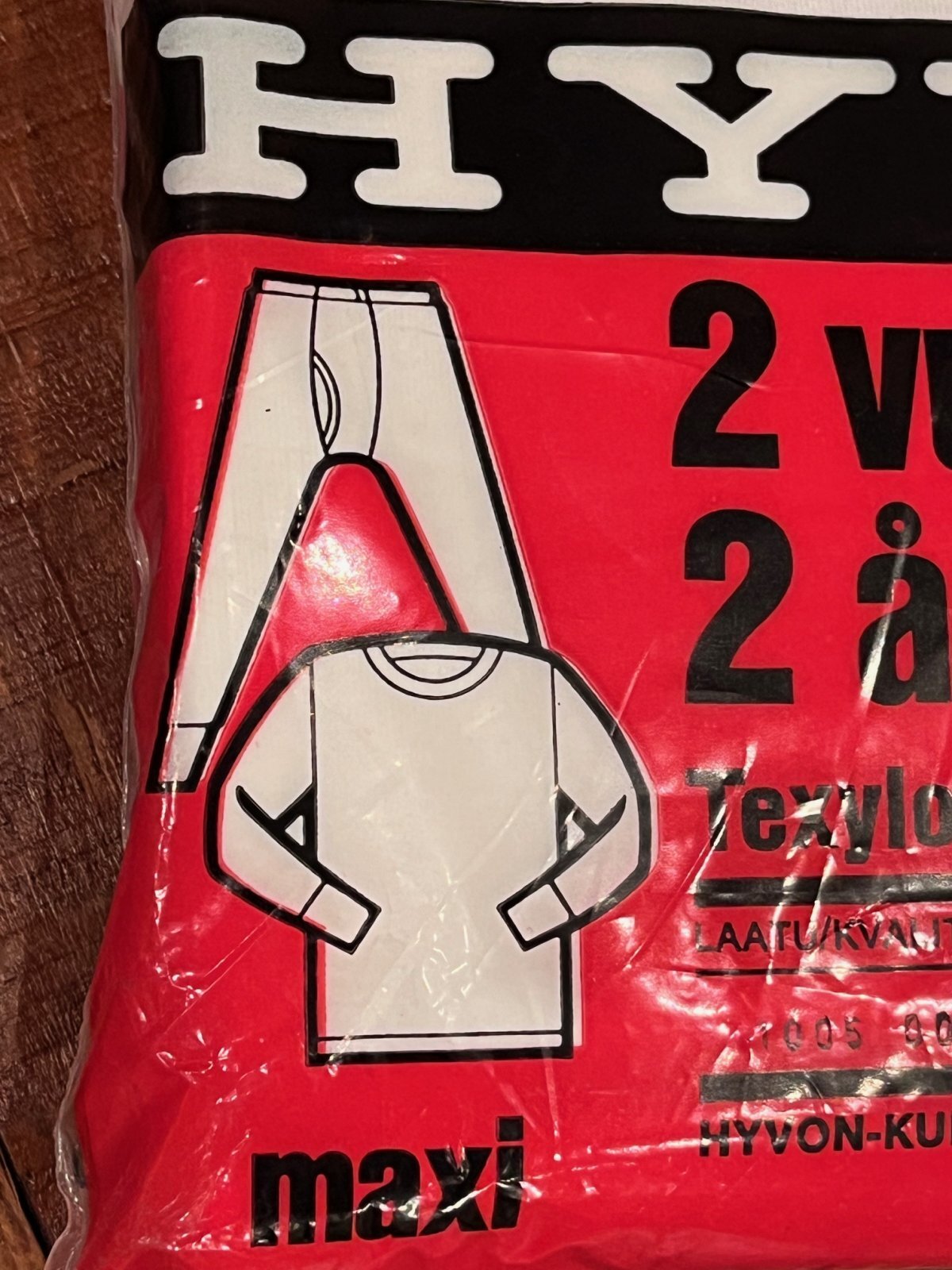 HYVON "MADE IN FINLAND" ロングスリーヴTシャツ+パンツSET入荷です。TEXYLONのベースレイヤー🏕当時のヒートテックのようなモデルだと思います。未開封のD.STOCK。とても良い状態です。あまり見ない北欧パックTEE。パッケージデザインも素敵ですので、お部屋のディスプレイ・コレクションにおすすめです。