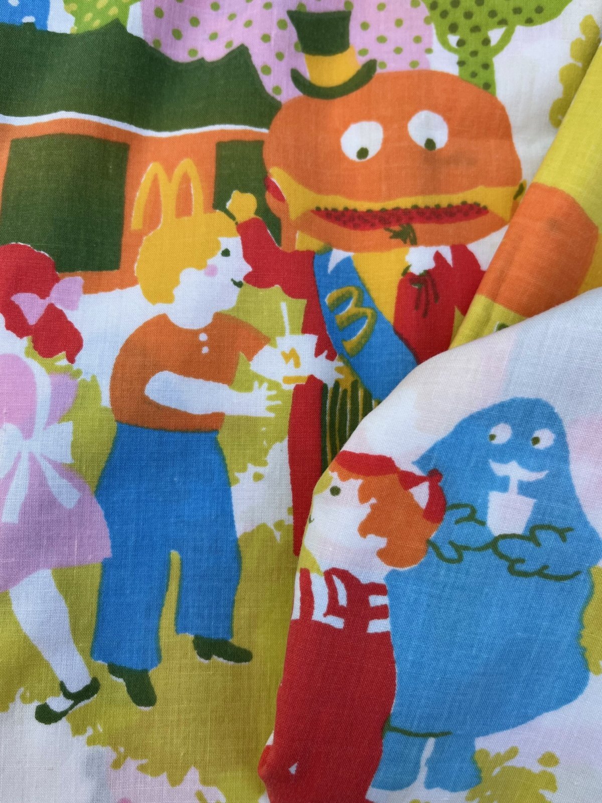 マクドナルド 1970年代 総柄🍔フラット シーツ入荷です。あまり出ないKINGサイズの大きな一枚♪♪ダブルですので、いつものTWINより かなり大きいです。 人気のキャラクター達が全面にデザインされたHAPPYなMcシーツ♪ まだプリントカラーもしっかり残っていて🍟とても程度が良いです。寝具として使うのはもちろん、リメイク素材としても活躍すると思います。お探しだった方に、おすすめです。
