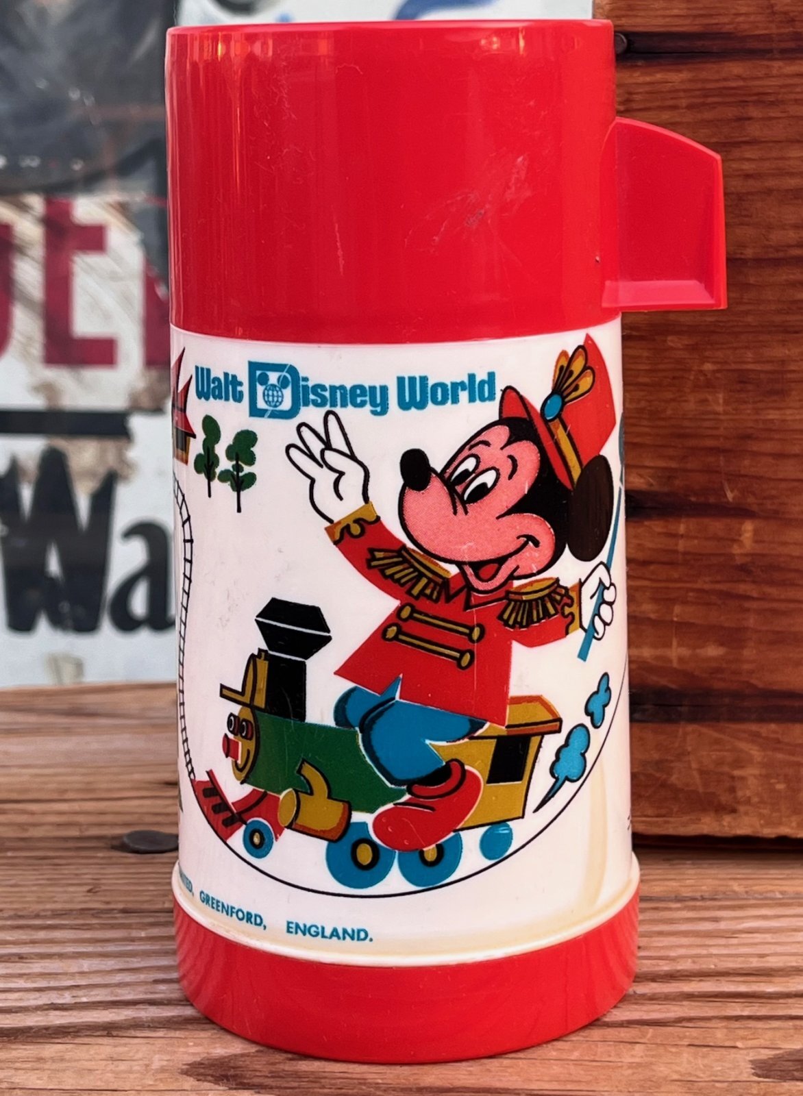 DISNEY WORLD 🏰 1970年代 アラジン社製 水筒入荷です。MICKEY MOUSEを先頭に、WORLDグルリ🌎デザイン♬ 全方位!隙無し!! どの角度も最高に!! 可愛いです。お部屋のディスプレイにおすすめです🥁