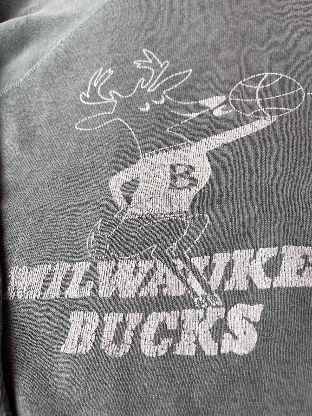 NBA MILWAUKEE BUCKS 1960'S KIDSスウエット入荷です。枯れ枯れにフェードした枯れ草グリーン🌱 ボディーの渋い一着です。チームマスコットのBANGOクンがデザインされた⛹️♂️GOODデザインです。右袖にダメージあり。高学年くらいのお子様に良いサイズです。お子様にはもちろん♬ NBA GOODSをコレクションされてる方にも、オススメです。
