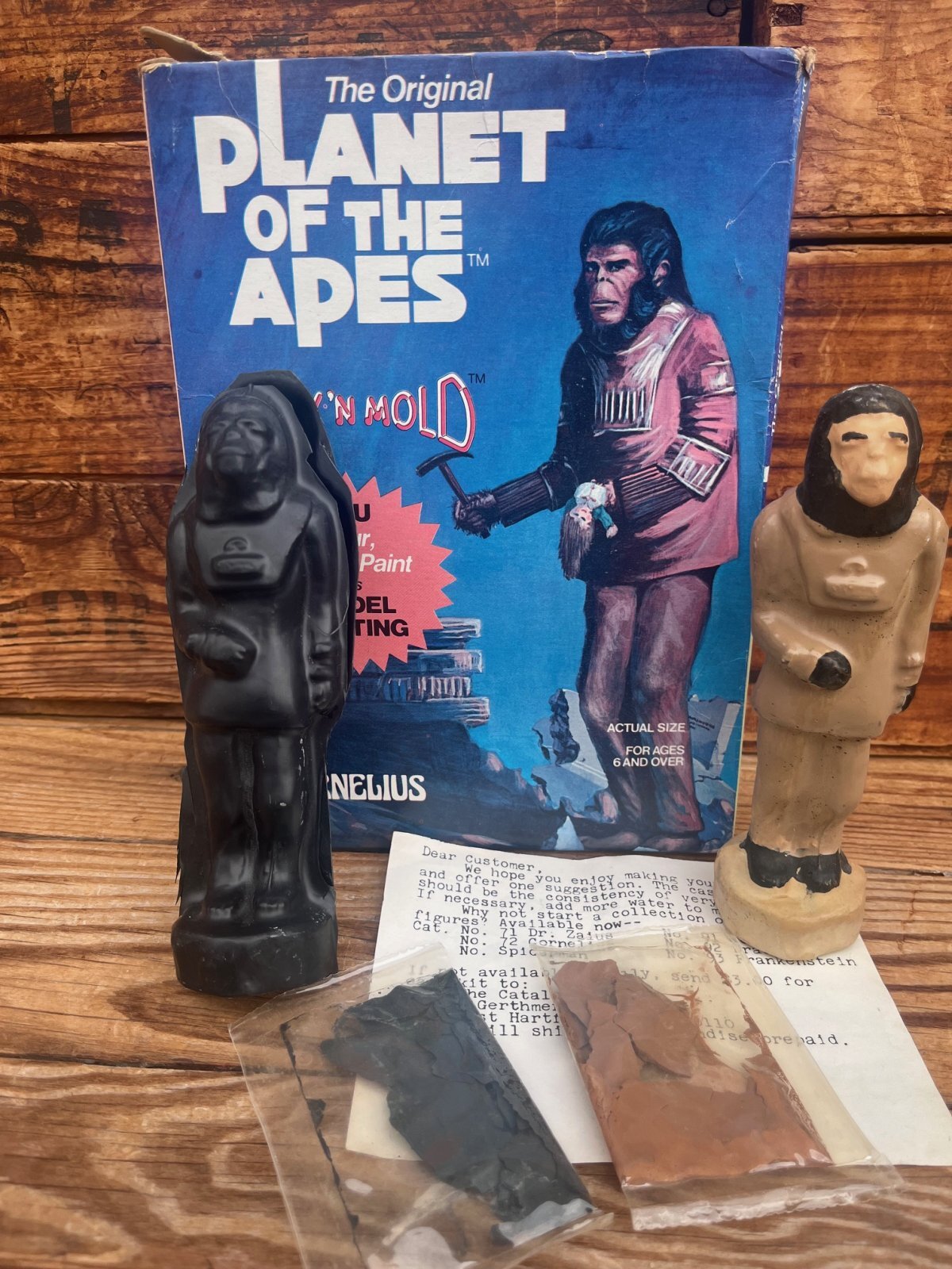 PLANET OF THE APES "CORNELIUS" 1967年 APJAC PRODUCTIONS社製 MODEL CASTING入荷です。型に、コンパウンドを流し込んで、フィギュアを作れるキットです。(経年によりコンパウンドは硬化しています。)前オーナーさんが、すでにコーネリアスを製作されています。ずっしり鈍器のような!重厚な一体(ᵔᴥᵔ)なかなか良い出来です。樹脂や紙粘土などをご用意いただければ、フィギュアを作って遊べます。カラー樹脂などで、ズラリとフィギュアを並べてもかっこいいですよ。箱のデザインが良く🗽お部屋やお店のディスプレイにもオススメです。