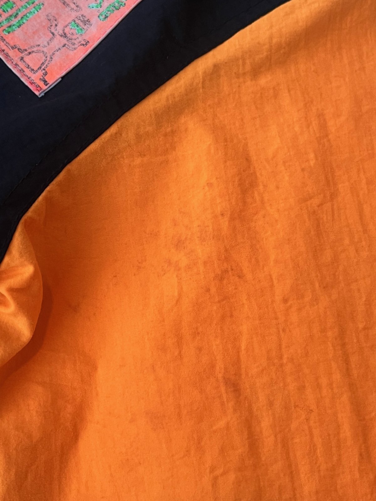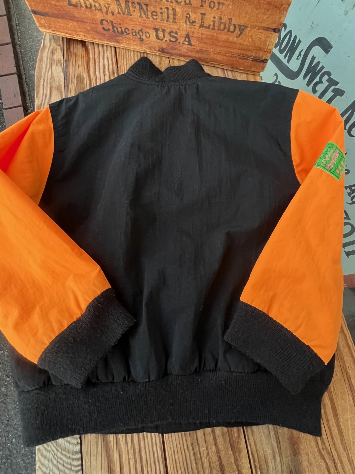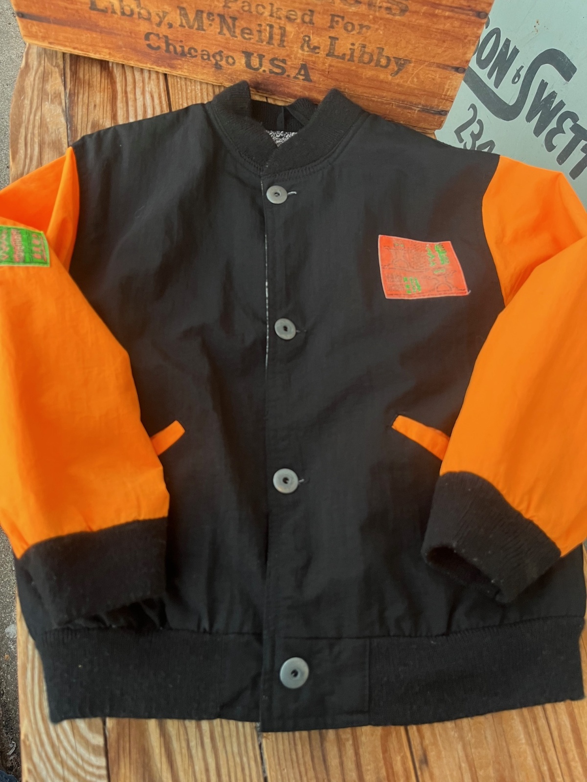 ANDY JOHNS 1980年代 KIDSシャカシャカJACKET入荷です。蛍光オレンジとブラックコンビに、サーフィンイラストパッチ付きの🏄♂️とっても可愛い一着です。左袖・ライニング部分にシミあり。(洗濯済みです)7歳表記:6〜7歳くらいのお子様に良いサイズです。4歳サイズのトルソーに着用させた写真を添えます。どうぞご参照ください。
