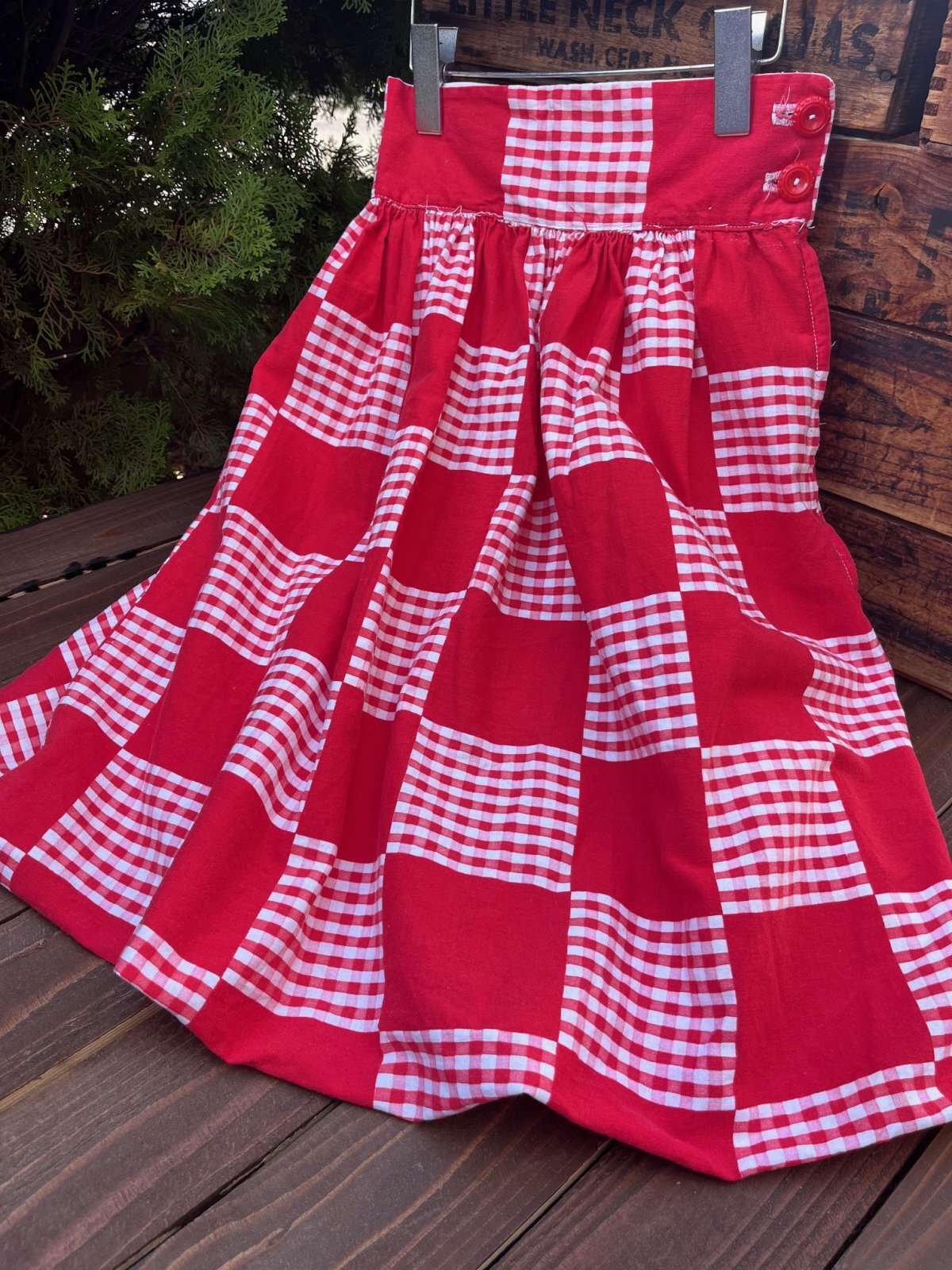 PATCH WORKプリント KIDS VINTAGEスカート入荷です。EMRAピンロックZIPPER。パッチワークデザインの♬昔の映画に出てきそうな(ᵔᴥᵔ)とっても可愛い一着です。ロングドレスですが、前のオーナーさんが、アメリカンVINTAGE KIDSあるあるの📍安全ピンで裾上げしていました。(一応、その状態でお届けします。)裾上げすると、より立体的なシルエットになって、素敵です。お好みの丈で楽しんでくださいね♪