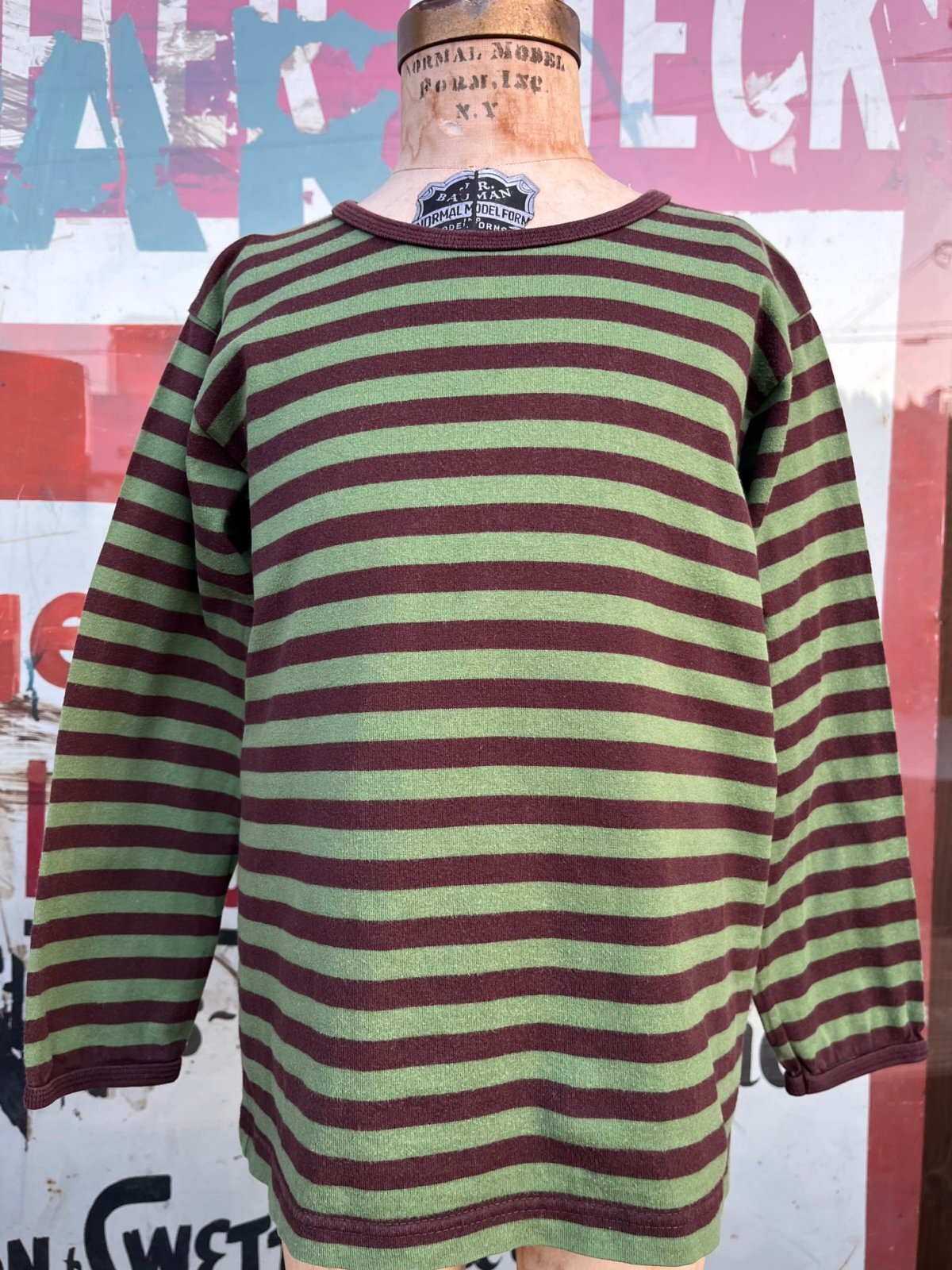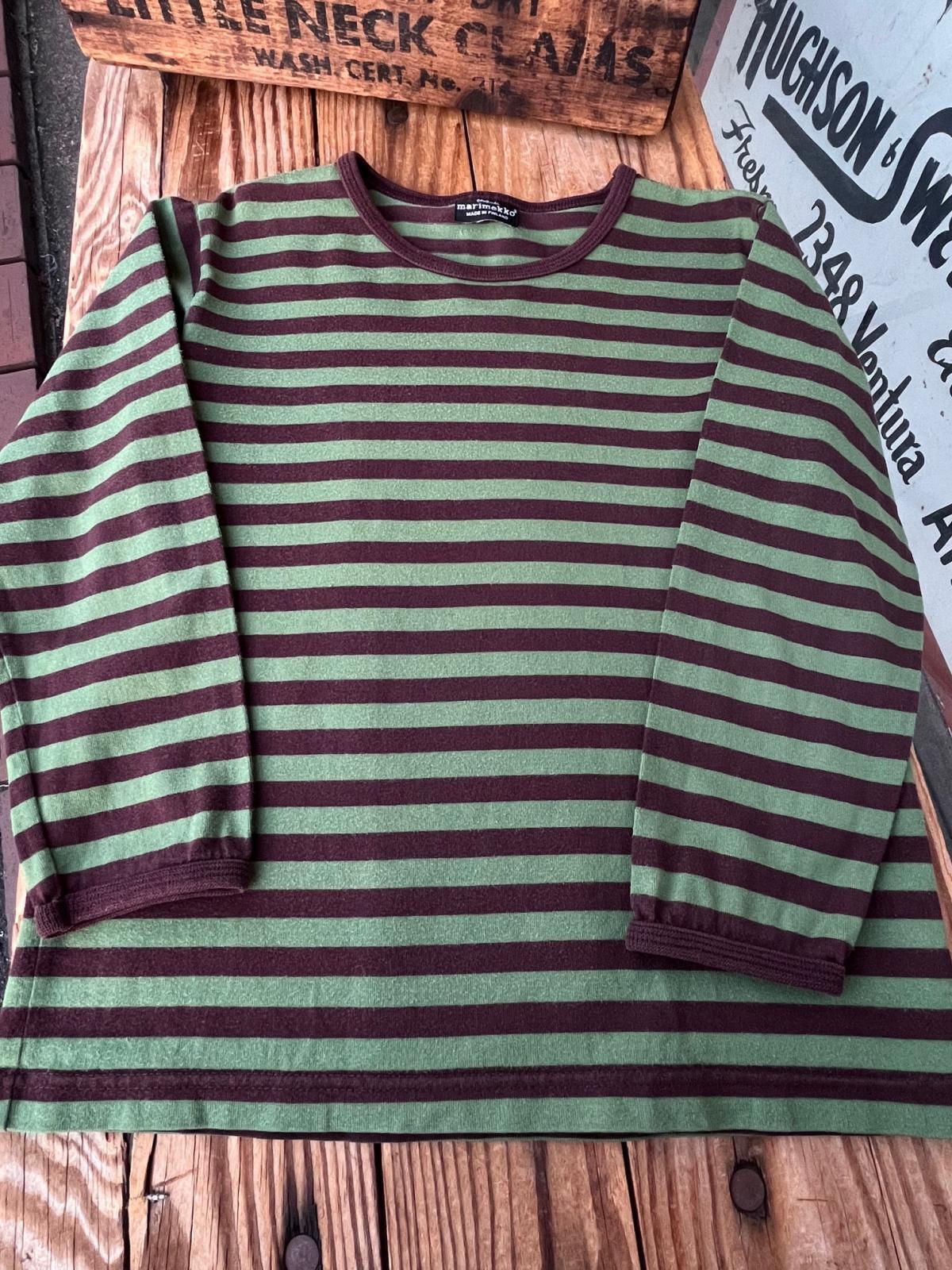 MARIMEKKO "MADE IN FINLAND"KIDS カットソー入荷です。抹茶チョコボーダーの渋い🍵美味しいカラーリングの一着です。120表記 : 6歳くらいのお子様に良いサイズです♫ 4歳サイズのトルソーに着用させた写真を添えます。どうぞご参照ください。