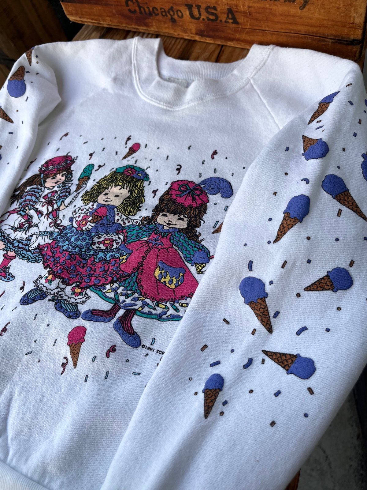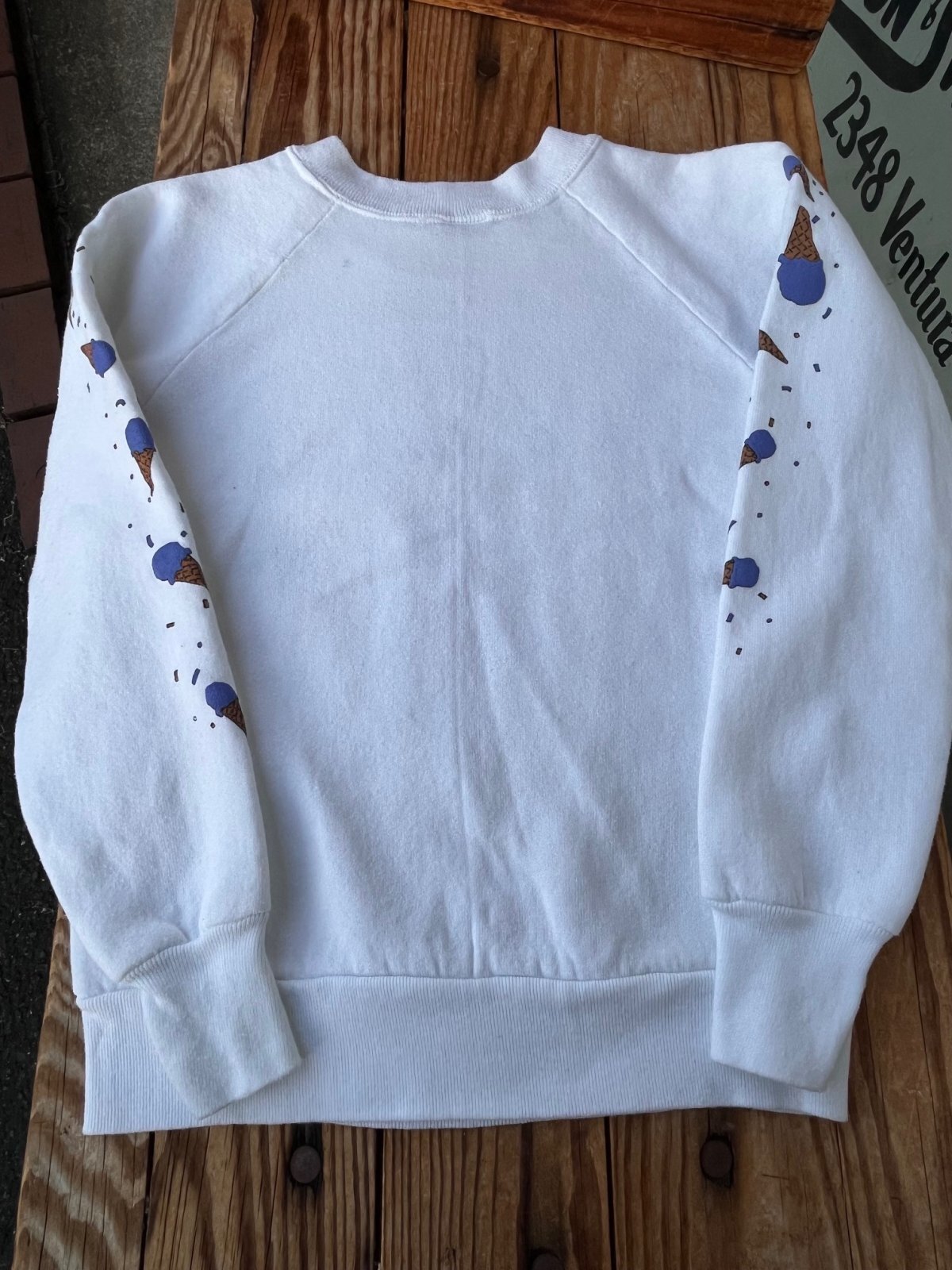 袖プリント🍨アイスクリーム連打♬♬♬SWEET SWEET SWEAT入荷です。10-12歳表記:6〜8歳くらいのお子様に良いサイズです。FRUIT OF THE LOOM USボディー🇺🇸フカフカの良い状態です。可愛いです。