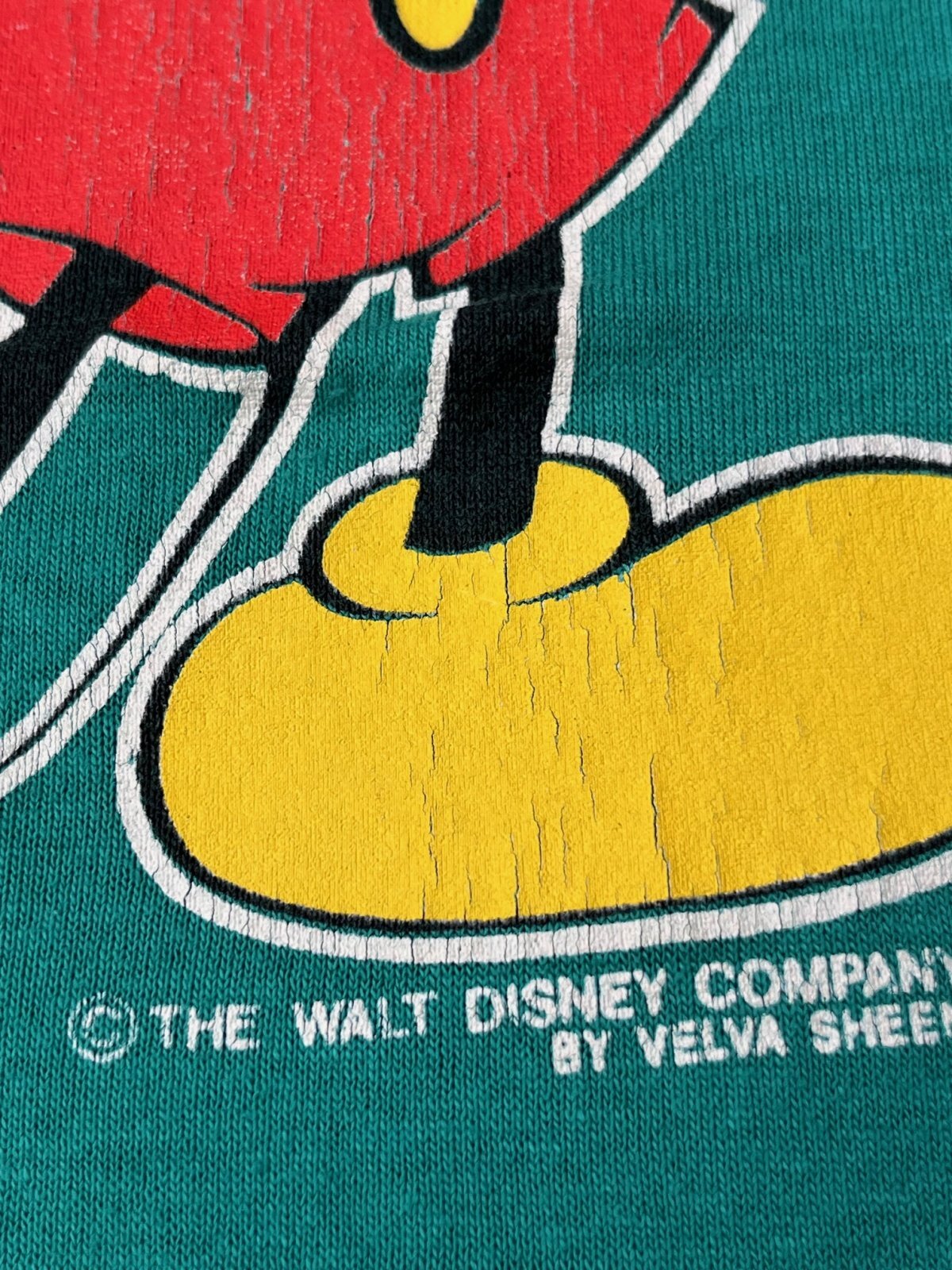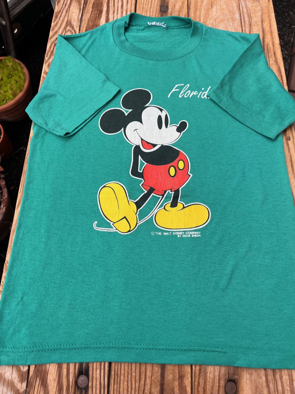 MICKEY MOUSE "FLORIDA" KIDS VINTAGE Tシャツ入荷です。VELVA SHEEN フロリダ🐠グリーンベースにクラッシックミッキーマウスが、大きくプリントされた一枚です。フロント裾、バック首下に、小穴があったので、縫い合わせて補強リペアーしました。8歳くらいのお子様に良いサイズです。
