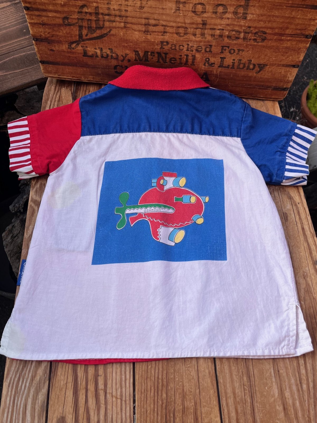 OSHKOSH KIDS "MADE IN USA" VINTAGEショートスリーブシャツ入荷です。SUBMARINE🇫🇷トリコクレイジーパターン×ローソンストライプ×くいだおれストライプの最強コンビ♪♪ガチャガチャで、とってもカワイイです。バックにシミあり。(洗濯済みです)3歳表記: 3〜4歳くらいのお子様に良いサイズです。OLDオシュコシュがお好きな方に、きっと気に入ってもらえると思います。4歳サイズのトルソーに着用させた写真を添えます。どうぞご参照ください。