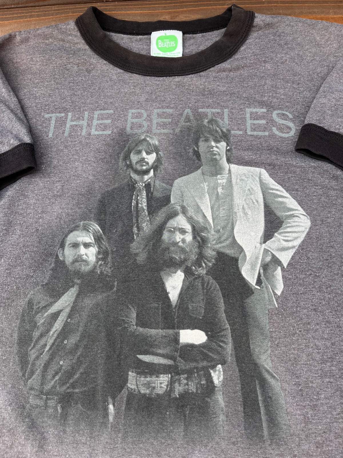THE BEATLES 2005年 Tシャツ入荷です。左袖に色抜けあり。グレー×ブラックリンガーに、モノクロプリントの後期BEATLES TEEです。