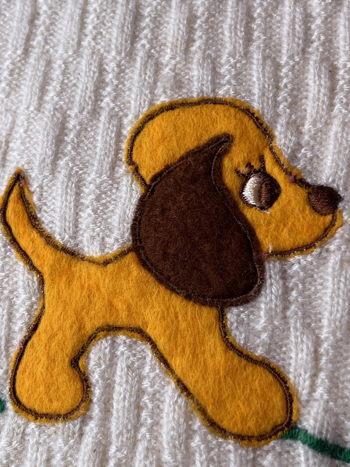 LITTLE ANGEL KIDS VINTAGEサマーニット入荷です。若葉の庭を歩く(ᵔᴥᵔ)わんちゃんデザイン♬ 最高にカワイイ一着です。首、袖、裾のリブカラーとの色合わせも完璧です。1歳表記:9ヶ月〜1歳くらいのお子様に良いサイズです。とても程度が良く(ᵔᴥᵔ)オススメの一着です。
