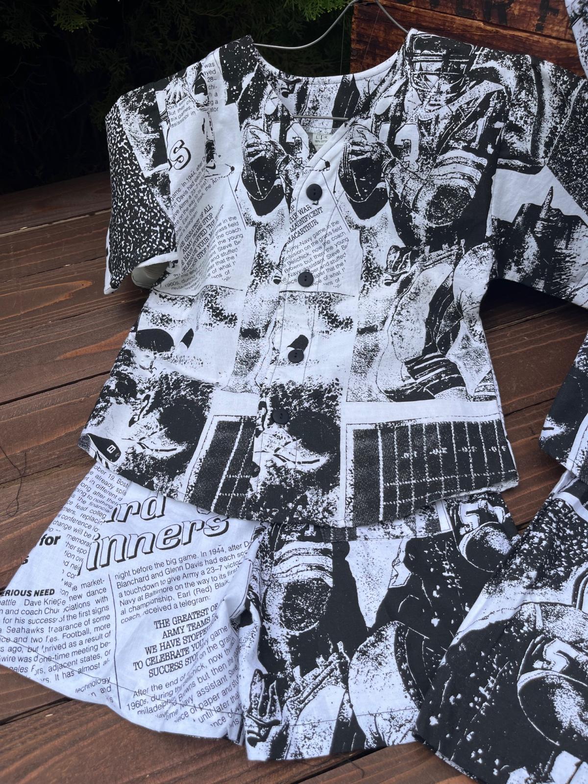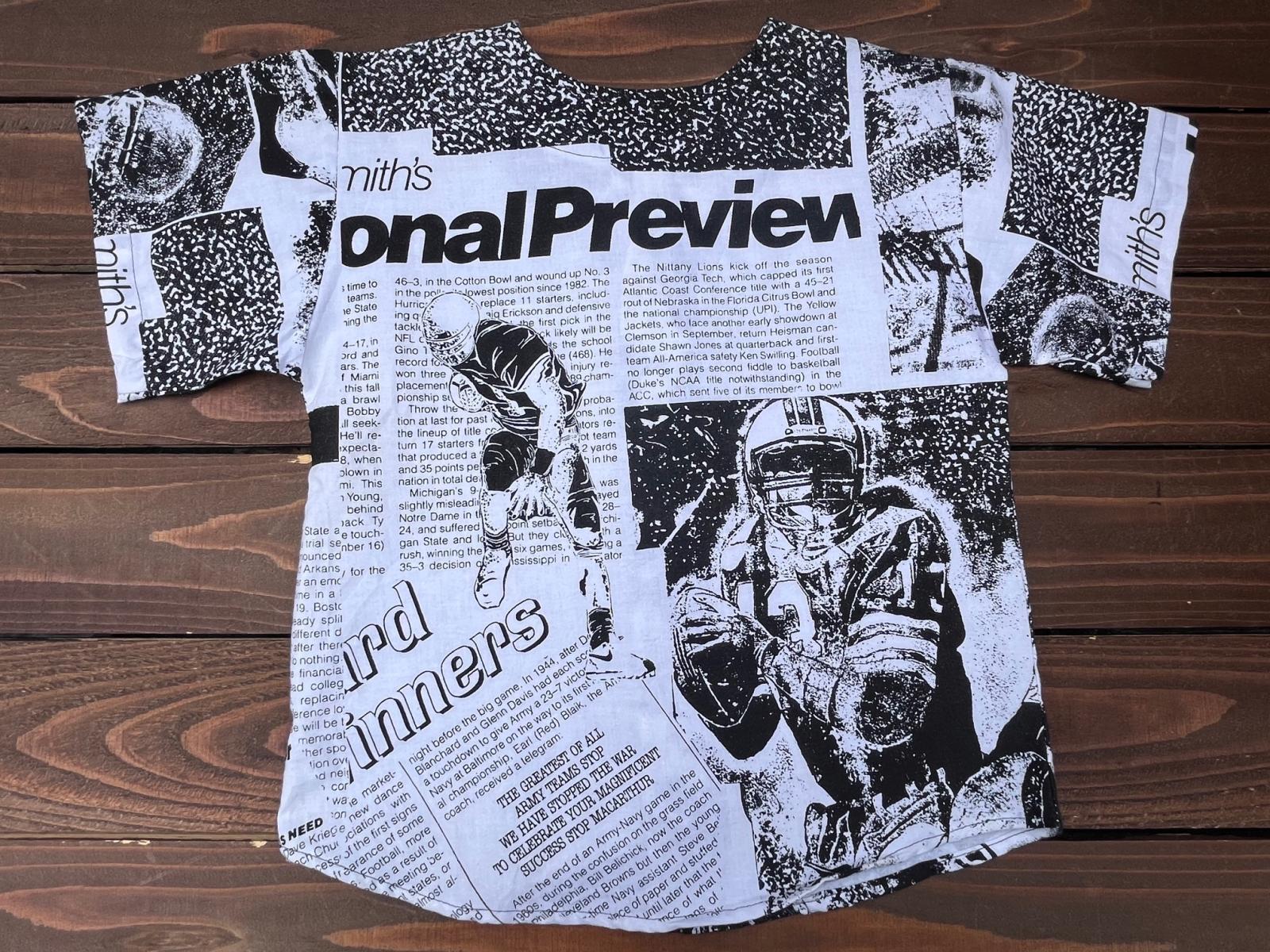 AMERICAN FOOTBALL "MADE IN USA" KIDS シャツ入荷です。アメフト🏟オールオーバープリント🏈モノクロカラーのGOODデザインの一枚です。未洗いのD.STOCKで、とても良い状態です。MEDIUM表記:4〜5歳くらいのお子様に良いサイズです。