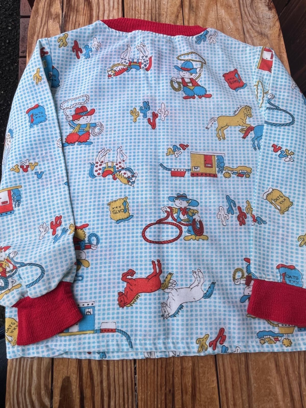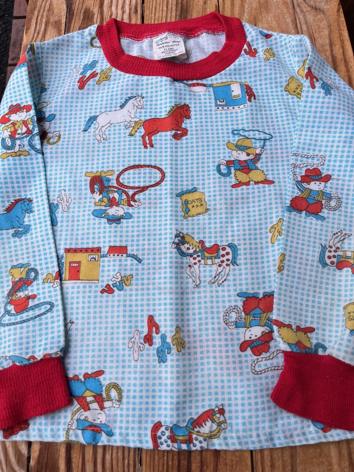 ちびっ子🐂カウボーイ🌵🌵 KIDS VINTAGE ロンTEE入荷です。ギンガムチエックボディーに、カウボーイ総柄の🌵🌵🌵とってもかわいい一枚です。ボディーのカラー🏜イラスト♪リブのカラーリング!コンビネーションが最高です。6-7歳表記:5〜6歳くらいのお子様に良いサイズです。4歳サイズのトルソーに着用させた写真を添えます。どうぞご参照ください。おすすめの一枚です。