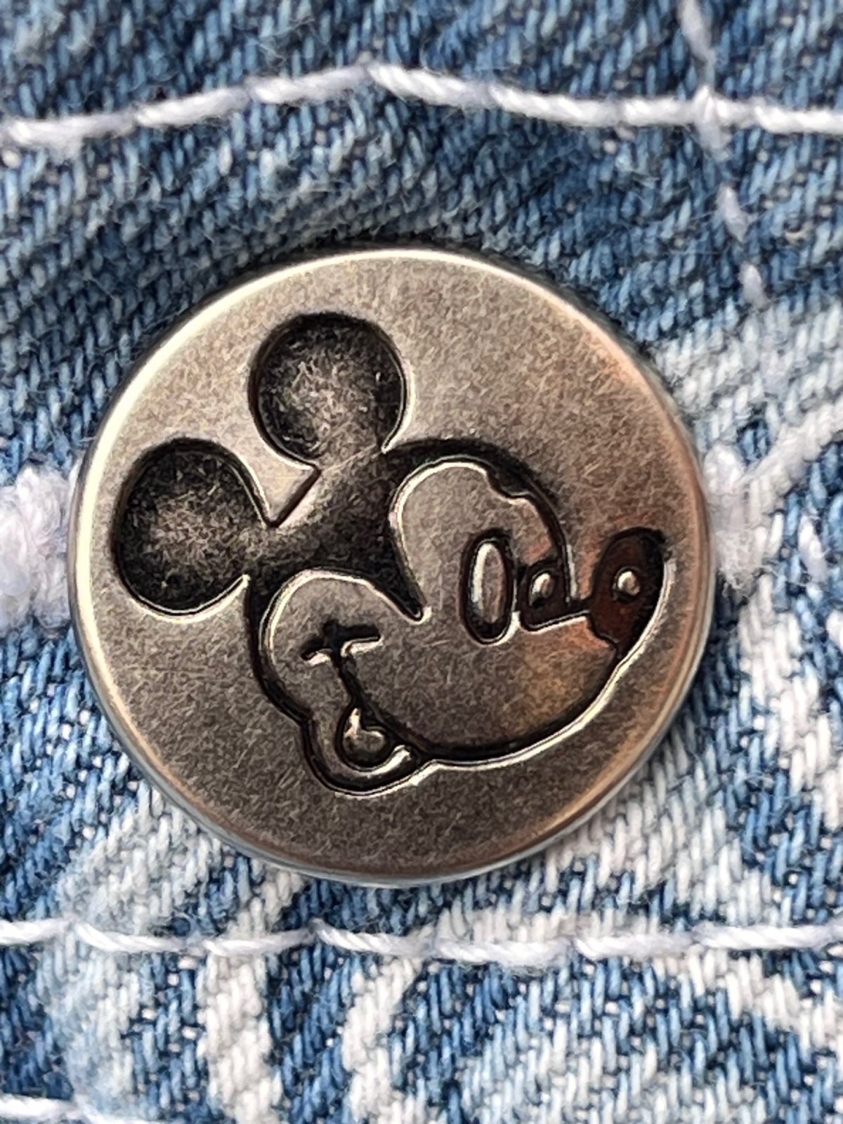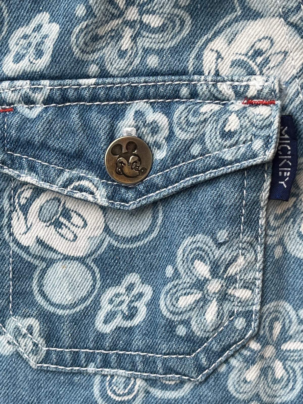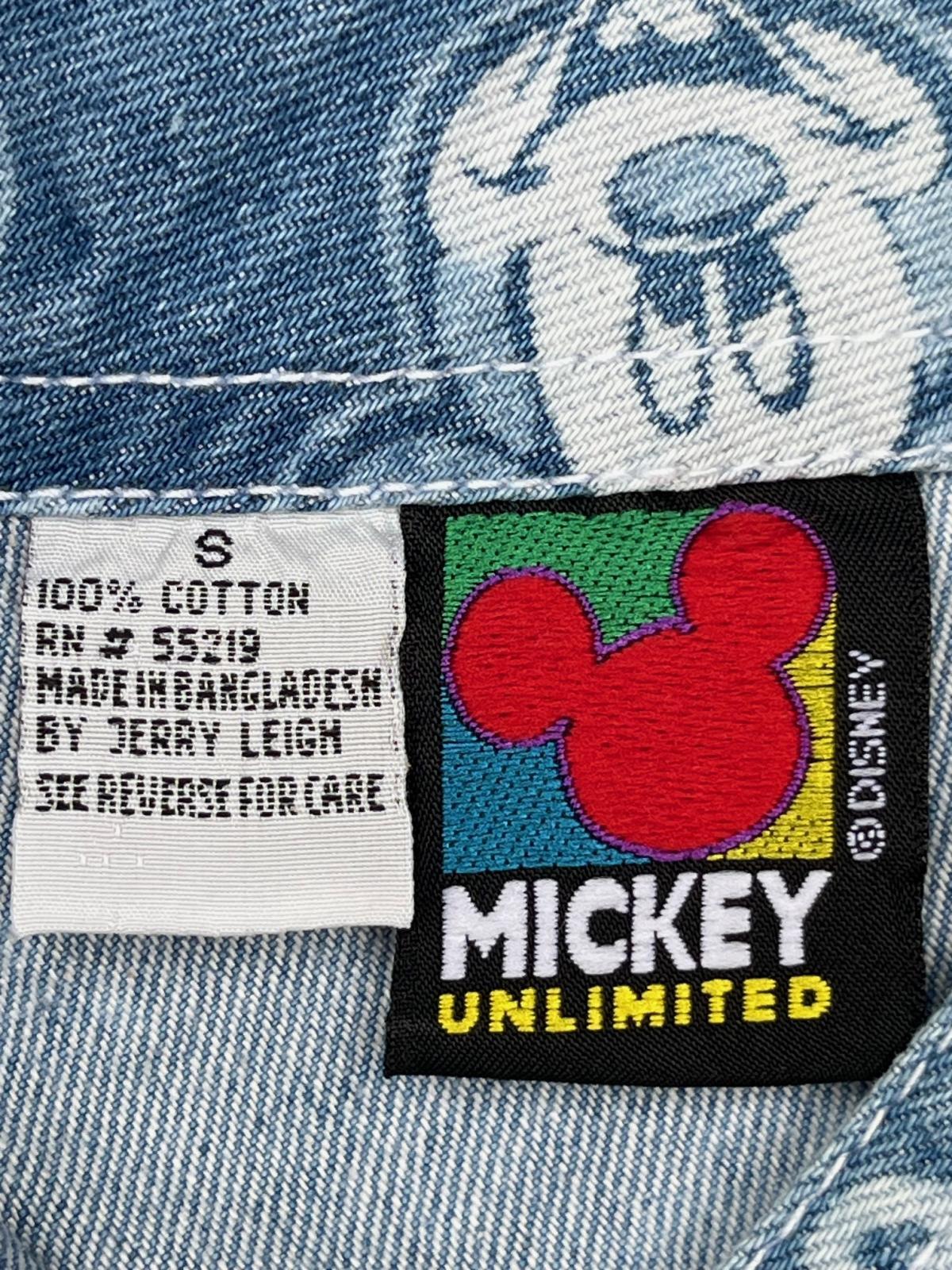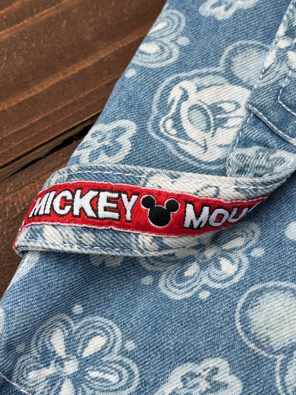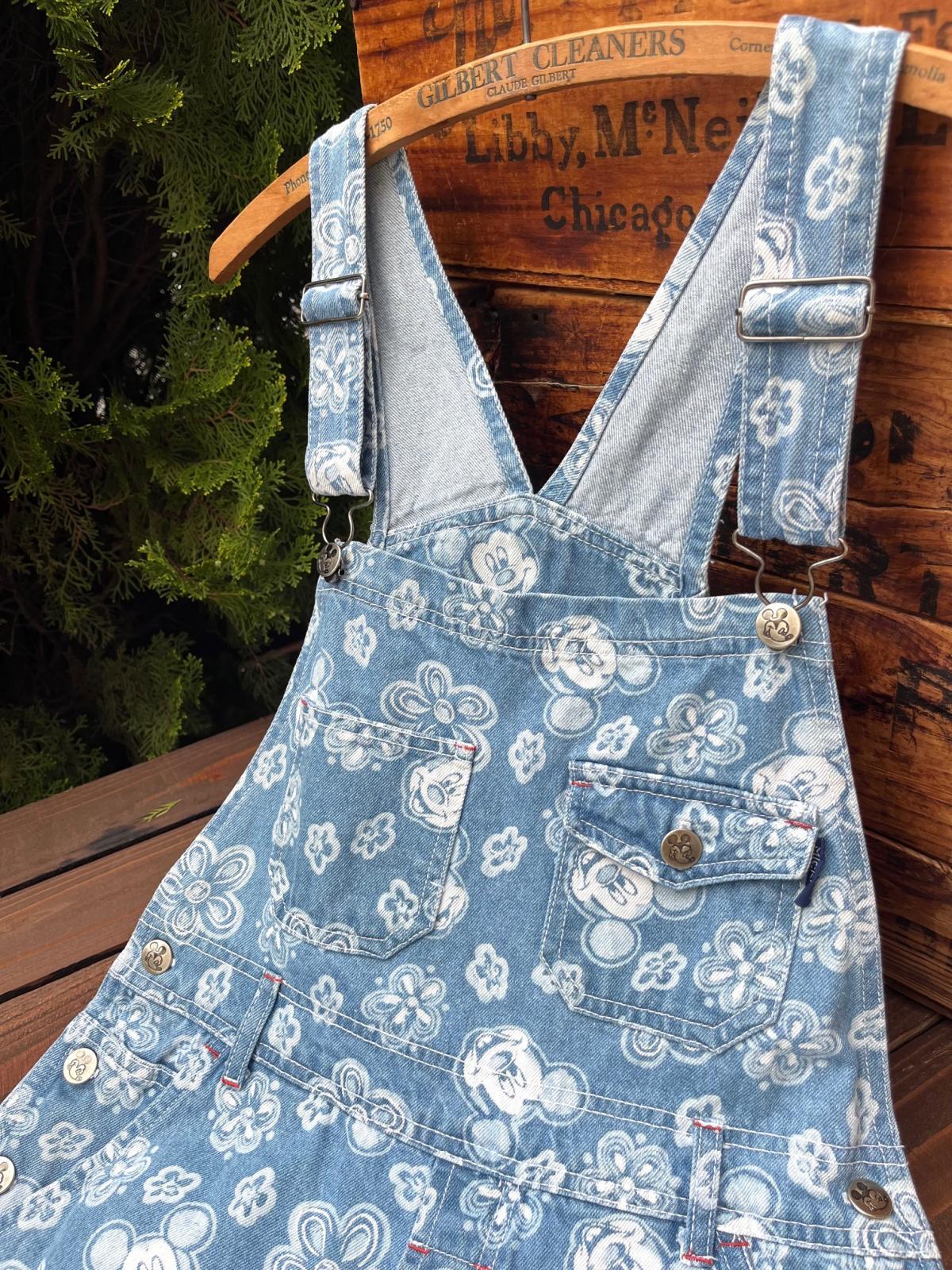 MICKEY MOUSE ”UNLIMITED"1990年代 ショートオール入荷です。デニム生地に、ミキ顔いっぱい(ᵔᴥᵔ)花とミッキーがバランス良く🏰散りばめられた♪オールオーバープリントの♪かなりハッピーなデザインです。後ろ裾にホツレあり。(後ろから接着芯で補強しました) SMALL表記 : 32インチ 大人の方も合わせれますが、高学年くらいのお子様が、オーバーサイズで合わせるとカワイイと思います。一応、53歳 170cm 65kgが着用した写真も添えます。(爆🚀)